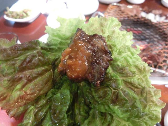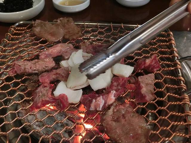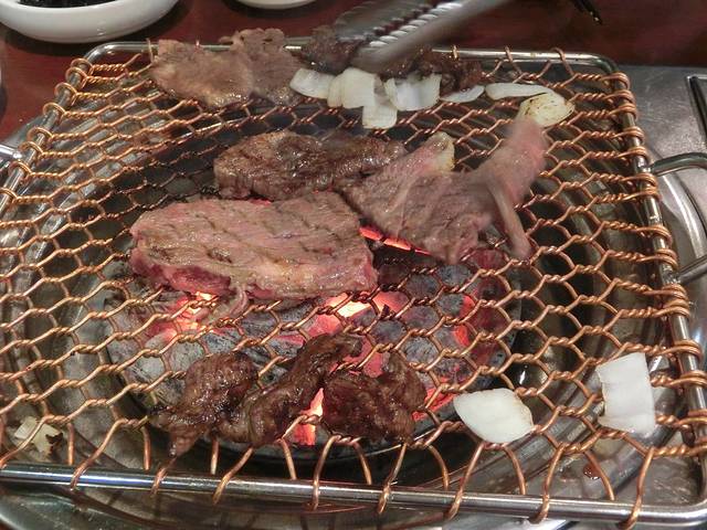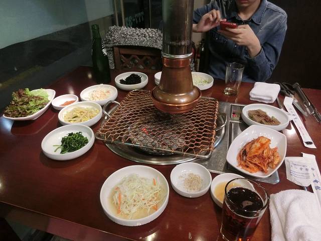 这里烤肉用的是炭火。据说这炭火也是很讲究的,使用的是在木炭中被认为品质最好的忠清北道忠州市产的榉树木炭。烤肉时倒还真是很好,劲道大,没有烟,我和LP是一边被热浪袭人的炭火烤,一边大口吃着烤肉。桌子上面有个大烟罩,小小震撼。