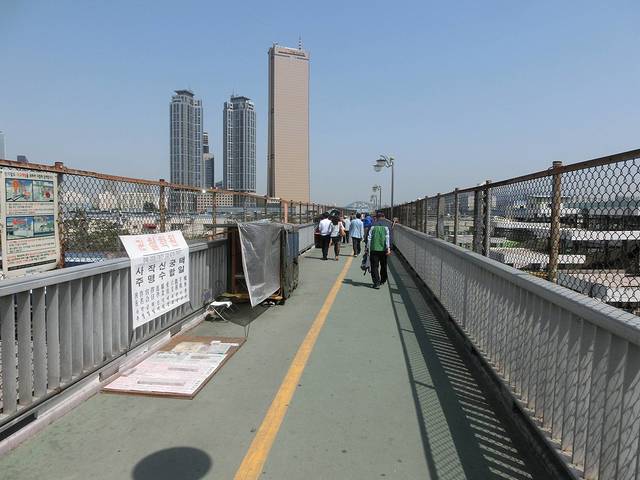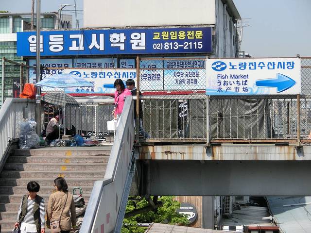 我们从市厅搭乘地铁1号线,到鹭粱津站下车,出站口在横跨铁道线的天桥上。而我们一出列车,空气中就隐隐飘来水产品的腥气。出站口,左边是去鹭粱津附近的市区,而正前方的天桥就是去水产市场的。天桥上还有中英韩日四种语言标注的指示牌,不用担心找不到路。我们沿着天桥步行约3-4分钟,就到了一个类似停车场的地方。其实这里就是水产市场的顶楼,平台上每隔一段距离,就有一个入口,沿着散发着浓烈海腥气(没做好心理准备的人,瞬间闻到那股子腥气,可能一下子还不太适应)的楼梯下去,就是大名鼎鼎的鹭粱津水产市场。