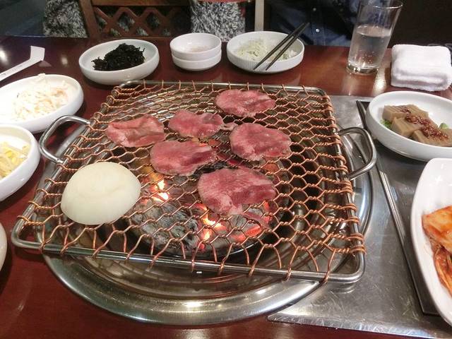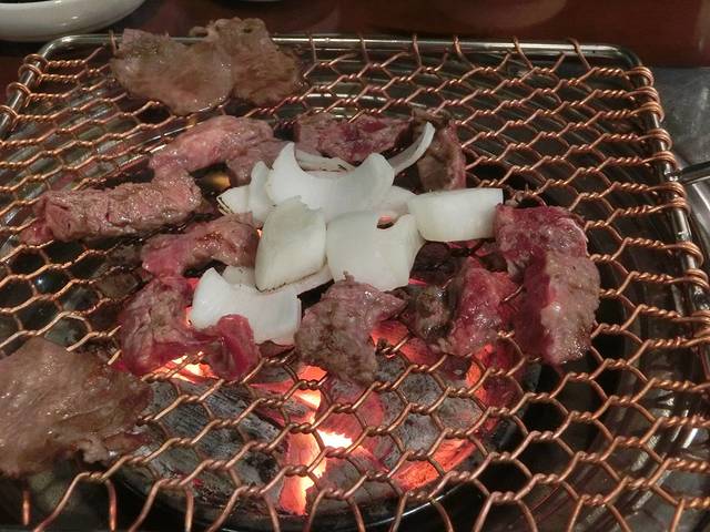 先烤牛舌,肥厚的牛舌切片,一放到火上,没多久边缘部分就如同跳舞般地上下翻动起来,服务员熟练地将牛舌翻转,我和LP瞪大眼睛,死死盯着那些在铜丝网上扑腾的小圆片,她有没有反应我不晓得,反正我是一个劲地咽口水。