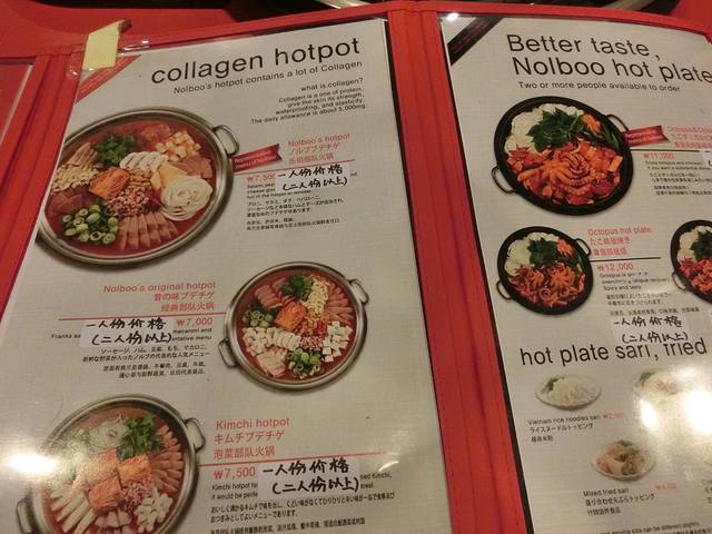大堂经理会说一点中文,我们入座后,他很热情地递上菜单,同时用有点生硬的中文问我们吃什么。菜单有中文注释和图片,让人一目了然。从菜单上看的出来,虽说是午餐肉、方便面什么的,但价格也不算便宜,一人大约是7000-7500韩元。经理推荐我们套餐,即2人份的部队锅,外加一份乐伯追加菜(单点5000韩元/包含生方便面+饺子+午餐肉+年糕+土豆面片)。具体价格我忘记了,但肯定比单点要便宜好几千韩元。