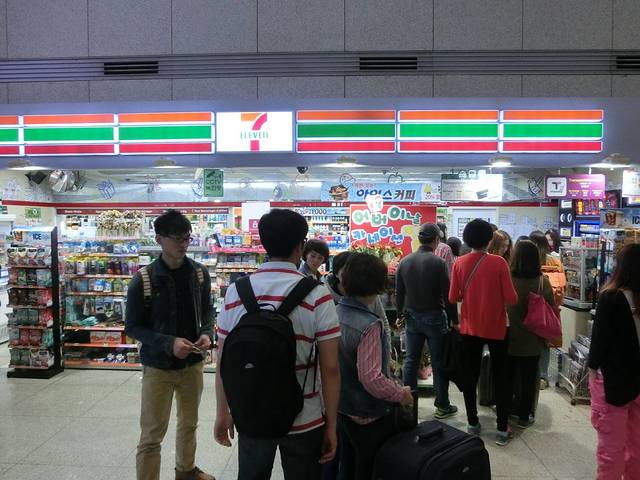 我们的卡是在Gate4 对面的7-11便利店(这种便利店和另一个品牌的G25便利店在首尔市内遍地开花)购买的,卡费2500韩元,我还充值20000韩元,1分钟就搞定了。由于这卡在便利店里也能买东西,我和LP就买了罐香蕉牛奶,先尝尝韩国的味道,哈哈!