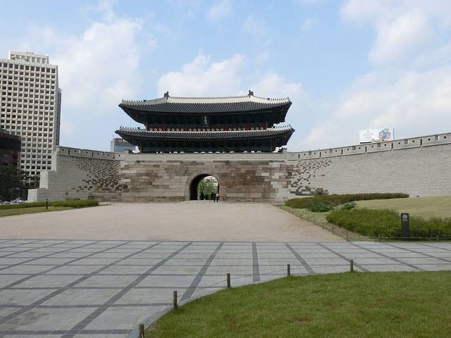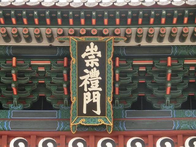 崇礼门是原朝鲜王朝王城城墙的南大门,建于1398年(朝鲜太祖6年,明洪武30年),是王城4座城门中最大的一座,也最为有名,因此在1961年,被定为韩国的第1号国宝。崇礼门的匾额是竖着写的,与其他城门的横写匾不同,据说这样跟风水有关,为了压制庆福宫对面的冠岳山之火气。不过话说回来,崇礼门自己的火气也的确不小,2008年就被人稀里糊涂纵火烧个精光,直到2013年5月才被重新修复。