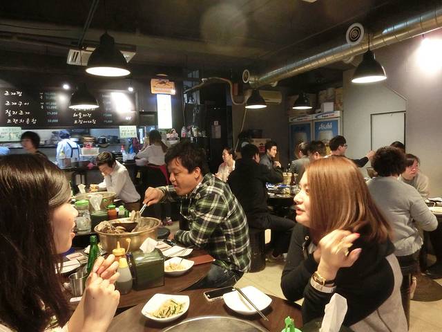 部队锅,顾名思义自然与军队有关。据说这是在驻韩美军基地附近的韩国居民用方便面、午餐肉等军用食品熬煮出来的汤锅。明洞的乐伯部队锅店位于一条小巷的二楼,不注意看还很难发现。走上二楼,才发现这店面还算可以。虽临近午夜,吃部队锅的人还是不少的。