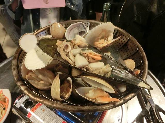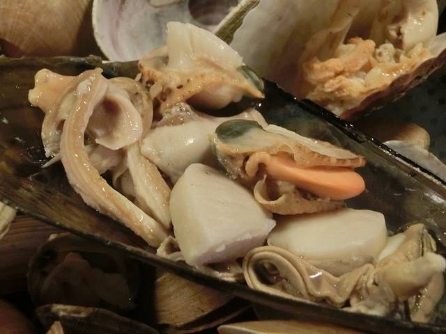 海鲜锅端上来后,下面用液化气炉加热。我们凑近一看,里面盛满了各种大小的贝类,包括栉江珧、大带子、扇贝等,最多的则是大蛤蜊,一个个在滚水里扑腾。海鲜锅里面没加任何佐料,仅靠清水煮出贝壳本身的鲜味。餐厅还提供酱油和芥末,供食客品尝贝壳而用。