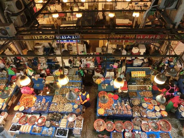 我外出旅行,都会挤出时间去当地的赌场、菜场和跳蚤市场。赌场属于消遣,跳蚤市场可以淘宝,而菜场则是体验当地人日常生活的一个好去处。这次来首尔,虽说实际只玩了2天半,我还是拉着LP去了首尔最大的海鲜市场——鹭粱津水产市场转转。拿海鲜引诱,LP也想不出不去的理由。