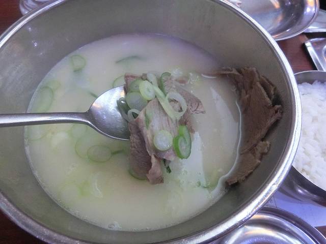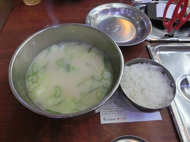 没多久,伙计就把雪浓汤端了上来,我一看,一个大大的不锈钢碗里,是一碗乳白色的热汤,里面有牛肉和大把的葱花。说白了,雪浓汤就是牛肉汤,无非是用带骨牛肉经长时间熬制而成,充分浓缩了牛肉牛骨的精华。不过这汤比较淡,我加了一点盐和辣椒粉,外加不少胡椒,这才吃出点味道来。尤其是加了点辣椒粉后,还真有点让人欲罢不能,食欲大开。这玩意儿主要是喝汤,牛肉虽也不错,挺有嚼头的,但相对汤来说略显平淡。虽说我们点的是普通份(大份10000韩元,量更多),就着米饭连汤带肉全下去后,感觉也挺饱的。
