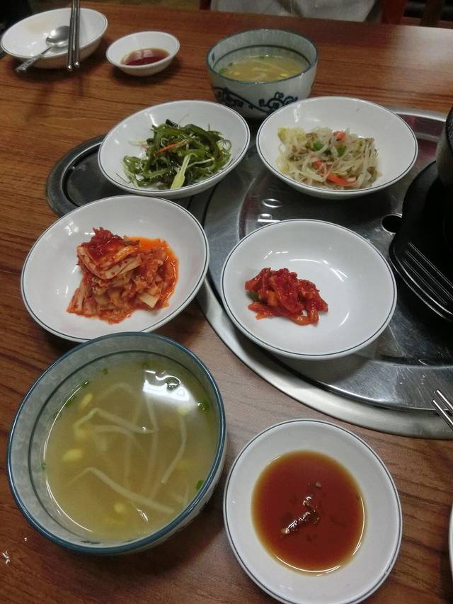 每人一碟豆芽汤,外加4碟泡菜,都是免费的。说实话LP和我吃不惯泡菜,也就吃点海带,喝点豆芽汤。那汤还不错,淡淡地带点类似胡椒粉的辣味,很刺激食欲。