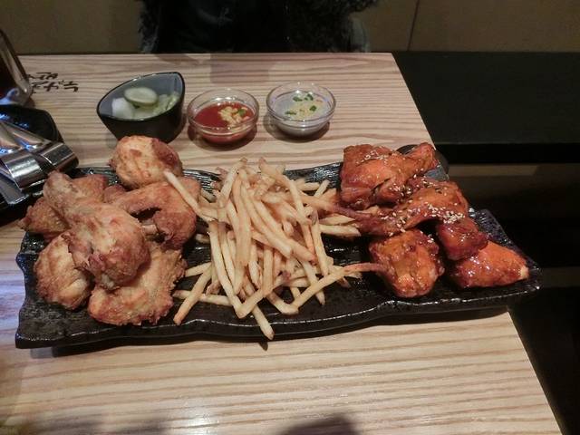 虽说已经晚上8点多了,店里还是基本坐满,我们来得巧,店员为我们翻了桌,在一楼角落就坐。这里有几个店员会说中文,而且店里的菜单也是中、英、韩三种文字的。