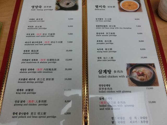 入座后,伙计手脚麻利地递上菜单、小菜和茶水。茶水似乎是大麦茶,飘着淡淡的清香,很好喝。这家店的菜单也做得很好,图片外加韩/中/英/日的注释,让人一目了然。我们没有多点,就要了2份主打的神仙雪浓汤(7000韩元/份)。