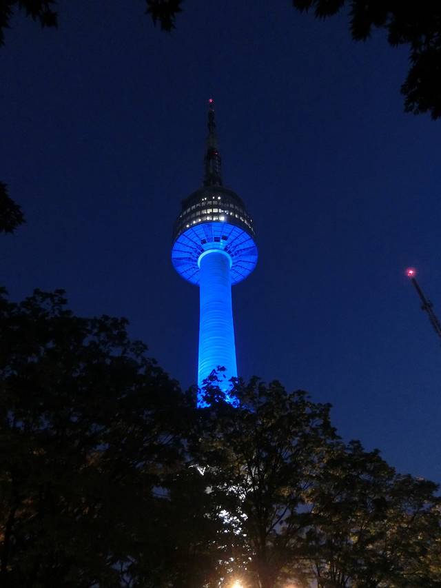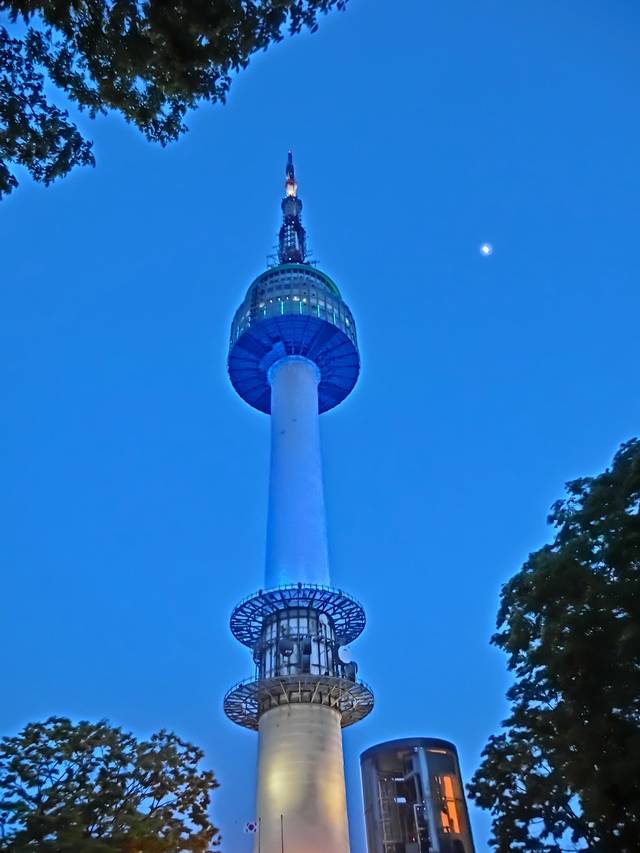 我们之所以要晚上来看N首尔塔,主要是入夜后,整个首尔塔会被环绕塔身的灯光所笼罩,散发出独特的色彩和魅力。当天晚上是塔身被蓝色光笼罩,透出一丝神秘和幽静的感觉。
