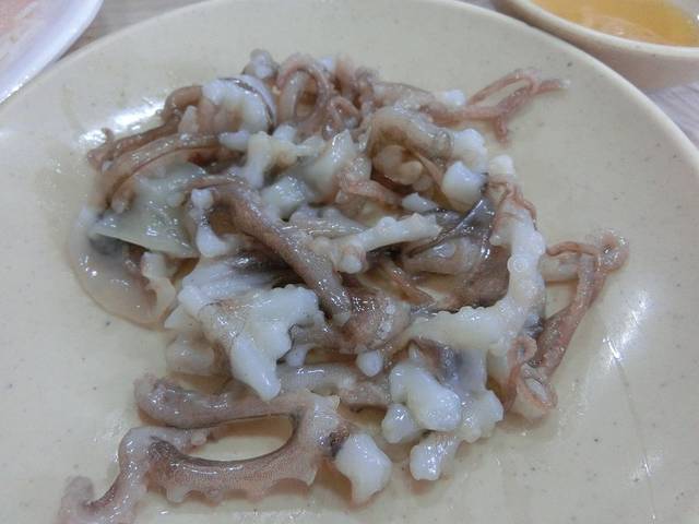 比目鱼的生鱼片,蘸上酱油和芥末,吃进嘴里,比较有嚼头,且没有什么腥味,非常好吃。冷菜中活章鱼是重头,切好的章鱼片端上来后,里面的触手及其他部分还不停地在蠕动。LP看着感觉有点肉麻,没敢动筷子。这东西要蘸麻油吃,我弄了一筷,送进嘴里后,就感觉触手上的吸盘吸住了我口腔壁,隐隐还有点小痒。然后我就嚼起来,那个劲道啊,别提有多爽了,于是一筷接一筷往嘴里送。LP看我吃得那么开心,忍不住也来尝尝看。虽说有点怪怪的,但口腔里又麻又痒的感觉还是很不一样,加上蘸上麻油的味道还是不错的,最后这么一小盘章鱼就被我们很快消灭了。
