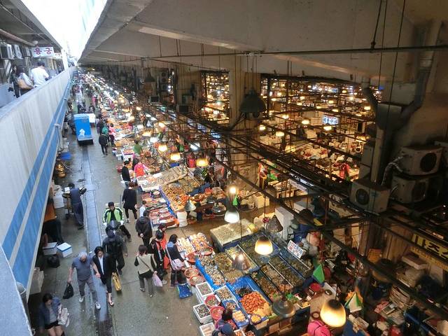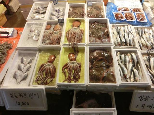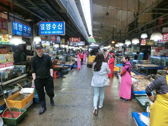 鹭粱津水产市场始建于1927年,距今已有80多年的历史,不仅是首尔,也是韩国最大的水产品市场。凌晨时分,韩国各地的水产品送到这里进行交易,当我们还在呼呼大睡时,鱼贩和交易商已在这里忙碌了,直到早上7点左右,批发环节基本结束,其后主要是接待来水产市场挑选海鲜的首尔市民,还有就是游客了。市场里的摊位一般营业到晚上8点,但现在24小时通宵的店铺也越来越多,总之,无论你何时到市场,都能买到、吃到新鲜的海鲜。