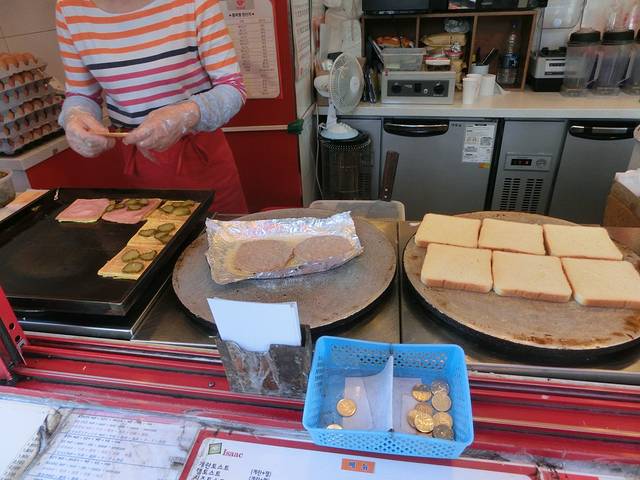 虽说当天是周六,非工作日,但还是有很多当地人来店里排队购买现做好吃的吐司。店铺不大,就一个女性工作人员当家,菜单就贴在制作灶台前,有韩文、中文及英文,点餐很方便。说穿了,这家店就是拿两块切片面包和中间的材料搭配做文章,但做到当地人及游客趋之若鹜也算是个本事。
