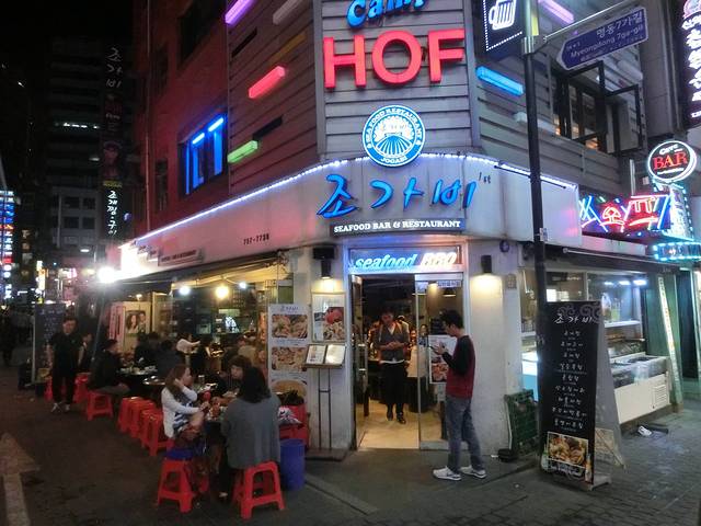 当天的晚餐我们两人事先都没想好,就在明洞一带转悠。我不爱吃鸡,LP又吃不光一锅参鸡汤,只好作罢。前一天晚上吃过豪华的韩牛烤肉,第二天再吃难免有重复之嫌。我们最后走到明洞剧场后面的小巷,发现了一家人气超旺的海鲜餐厅—— Camp HOF。正值饭点,这家店不光里面坐满,店外的露天座位也座无虚席,甚至还有好多人在门口排队。