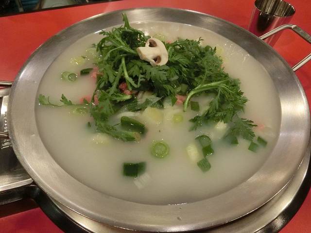 待到汤锅上来,我乍看还以为上错了,又来一锅雪浓汤。汤头是白的,略显清淡,上面都是茼蒿、蘑菇和葱段等蔬菜,隐约能看到火腿肠和午餐肉。