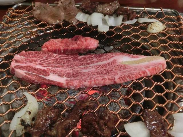 烤肉的食材没多久就端上来了,由服务员帮我们烤。话说回来,我们自己也烤不好,糟蹋了那么好的肉也是种罪过,还是交给服务员吧。