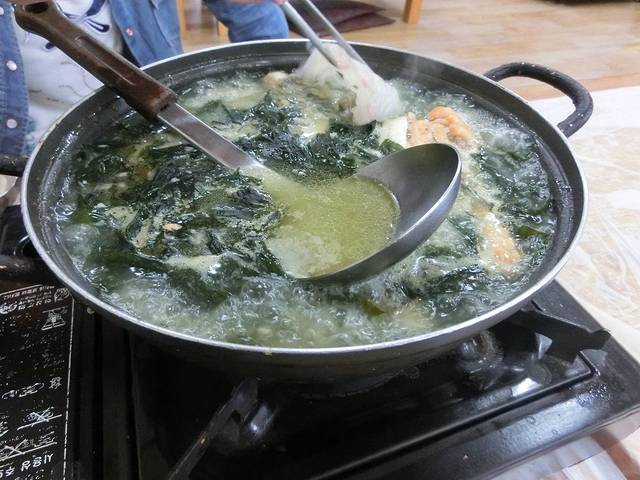 最后则是以一大锅鱼汤压轴。翻滚的白色热汤里,铺满海苔菜,以及比目鱼的边角料。尤其是那个汤,充分吸收了海苔和鱼杂的味道,鲜味浓郁。我们俩也不怕烫嘴,喝汤吃菜,直吃得额头冒汗。幸亏这不是辣鱼汤,不然那劲道会更足,要是冬天来韩国,到鹭粱津吃上这么一锅热鱼汤,那感觉真是无法用语言来形容。