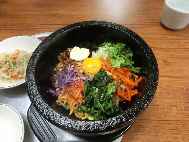 石锅拌饭很快上来了,那石锅我们都觉得也有点时候了,边缘都开裂了都。咋一看,根本看不到米饭,上面铺着五颜六色的食材,牛肉丝、紫苏、生菜、胡萝卜、泡菜,外加鲜黄的一个生鸡蛋,颜色搭配得非常养眼。将食材和米饭拌匀后,我吃了一口,觉得没有国内吃过的拌饭那么厚重,应该是这里菜多饭少的缘故,辣不抢味,很好地混在米饭和蔬菜中。据说加入拌饭的辣酱还是这家店的秘方,跟别的拌饭店都不一样哦。米饭的量不算很多,一个女生吃吃刚刚好,男的来说个人感觉略少,需要适量搭配其他食物。