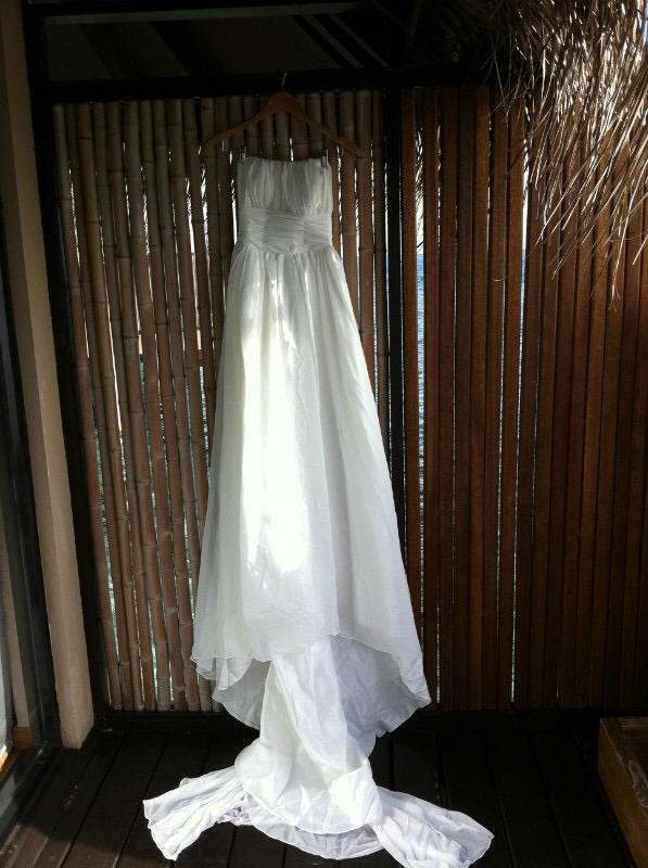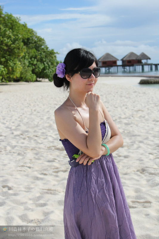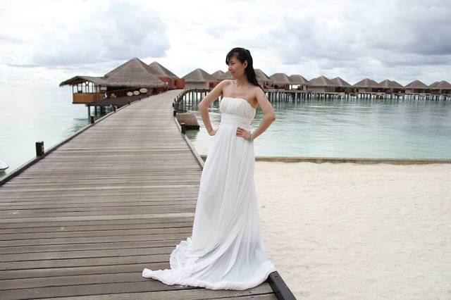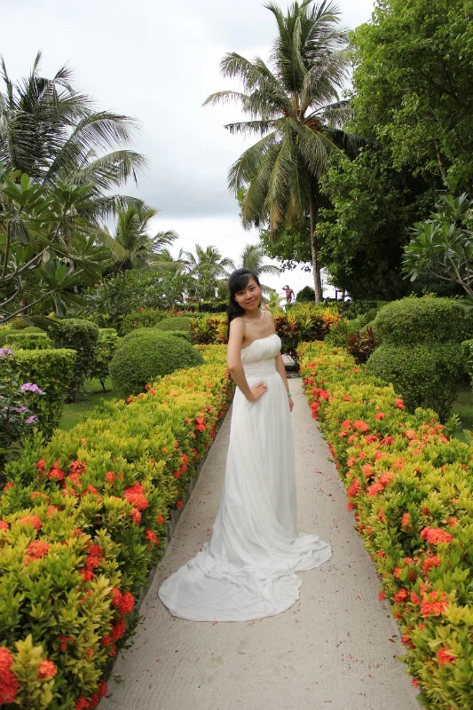 话说我还是第一次自己化妆,总觉得穿婚纱一点妆不化会很奇怪,所以折腾了半天,自己看着大概满意,换上婚纱,老公也换上衣服就出发了。我们来到早上的那个亭子,调整半天,照了一些照片,那个地方太美了,我们恨不得每个角落都照下来,折腾了近两个小时,老公累的不行,衣服全湿透了,我们决定回去休息再出来照。到了房间,感觉妆贴在脸上也不舒服,就全卸掉了,洗了个澡,躺在床上看大海,惬意!老公坐在按摩浴缸里看电视,也很享受。避过中午最热的一段时间,下午接着出去照,索性不化妆,换个发型,向着沙滩走去,结果老公发现一个小花园,我们在那里照 了半天,再到沙滩的时候,已经没有太阳了,沙滩婚纱以失败告终。