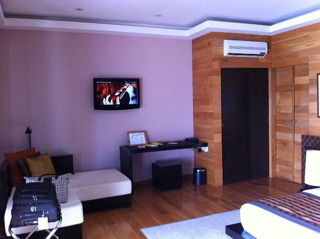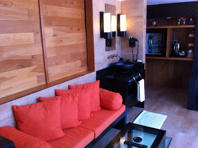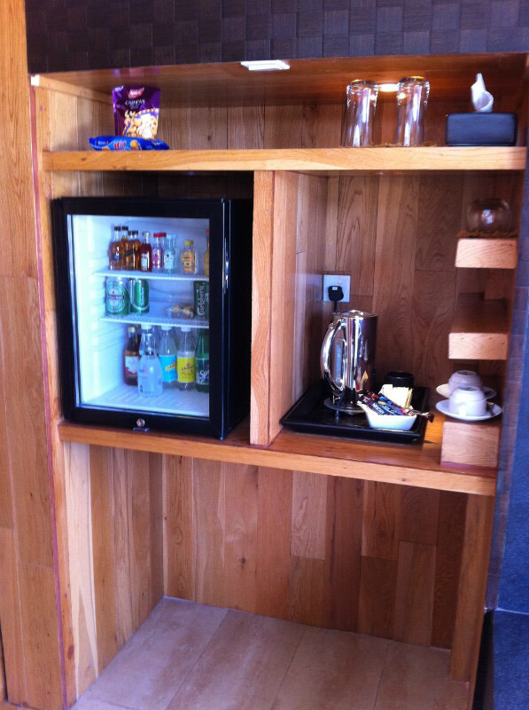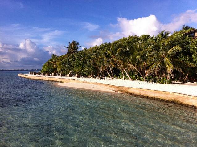 找到接我们的人,上了小船,船上已经坐满了人,都是老外,一个老外还很好心地给我救生衣让我穿上。我看到那海水眼睛都直了,这水怎么能这么清,这么绿,拼命地拿手机狂拍,之后的几天才发现这水太小儿科了,马代到处都是这样的水,大片大片的,跟拼图似的,一块绿一块蓝的,很美!10几分钟后,我们到了小岛,迎接我们的人把我们带到餐厅休息,虽然这时已是新加坡2,3点了,可马累的时间晚三小时,所以当地时间也就中午,还没到12点check in的时候,我们坐了半天,见到了我们的管家,然后带我们去了房间,sunset room 817.正值中午太阳很大,我们在房间休息好半天,里里外外转了好几圈,很开心,环境很舒服,老公说我们该出去了,等一下太阳就没了。老公的话是对的,幸亏我们早点出去,拍了一些晴天的照片,不然会很遗憾,因为接下来的几天都是阴天,再也没这么大的太阳了。