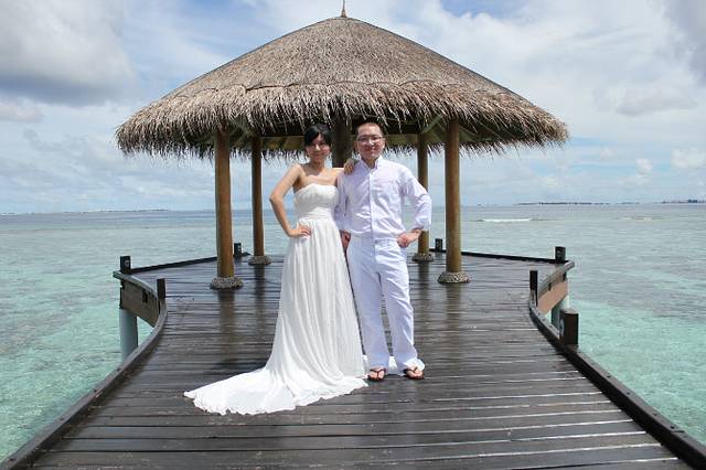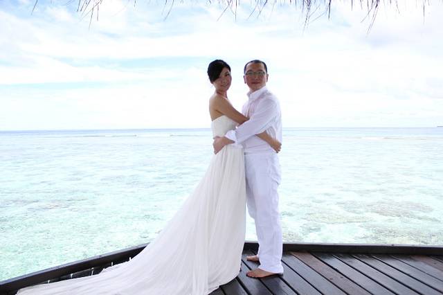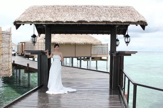 早上6点左右,终于起床了,简单收拾一下去吃早餐,可出门后,却被另一个方向的神秘带走了,因为我们看到了海豚,远远的,一排排,只能看到一波一波的鱼鳍,所以我们想离得更近一些,就向水上屋的深处走去,原来里面的房子也别有洞天,是日式风格的,在尽头我们看到一个亭子,周围一片大海,我们决定在这里照婚纱,那个水太美了!