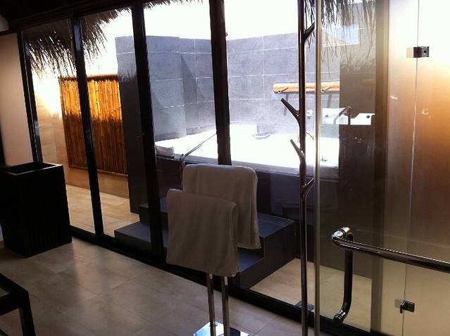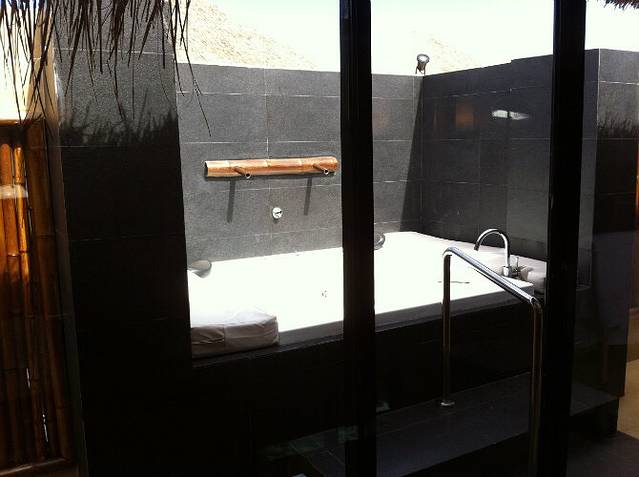 回到房间,玩起了按摩浴缸,水柱冲击身体的感觉很爽,比做spa舒服多了,可能我还是享受不了人力吧!当我们再去浮潜的时候,天要黑了,我们忘记晚上会退潮,水浅了很多,珊瑚都露出来了,根本不能浮潜,我们随便扑腾扑腾就回去了!老公不死心,就到我们水屋的下面去游,虽然可以游,但水下的景色没有海边的好看。
