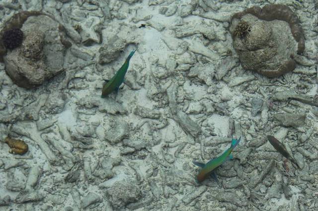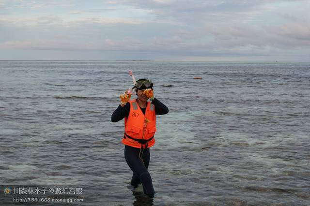 借了装备回去休息一下,就向沙滩进发了。中午的时候,因为阴天不是很热,海水也比较温和,我们两人在水中浮潜,真是水上水下看到完全不一样的东西,当头探到水下的时候,感觉珊瑚离我好远,用手摸不到,鱼儿在其间穿来穿去,什么样子的鱼都有,什么颜色都有,奇怪为什么鱼能长出像地图一样的颜色呢?!可是浮潜真的很耗力,游一下下都觉得好累,我们又是平时不怎么运动的人,决定回去休息一下,再来游!