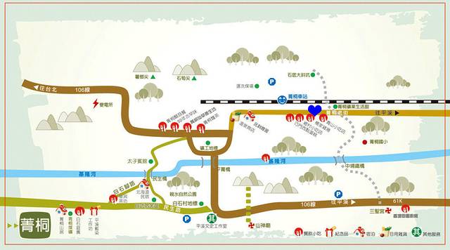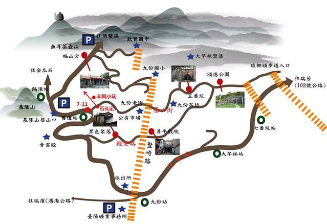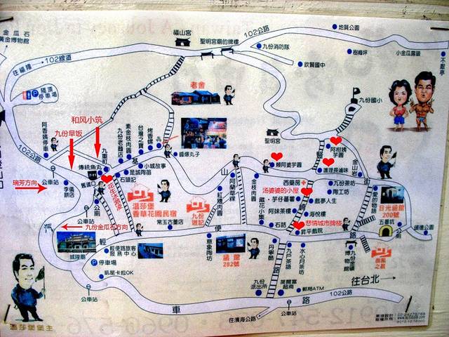 和风小筑的老板说,九份从地图上看就像一个【丰】,基山路、轻便路、汽车路形成了三条平行线,竖崎路贯穿于其中。