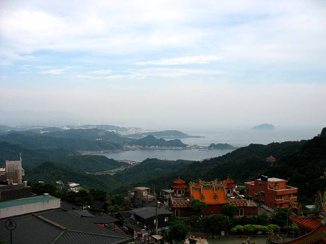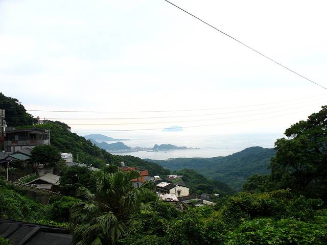 在九份茶坊前的瞭望台远眺基隆港,小城民居散布在山腰间。以此为据点,往左是五番坑方向,往右便是竖崎路了。
