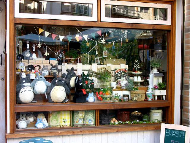 这家店里面都卖龙猫的周边产品,一橱窗的龙猫,好奇地看着窗外。