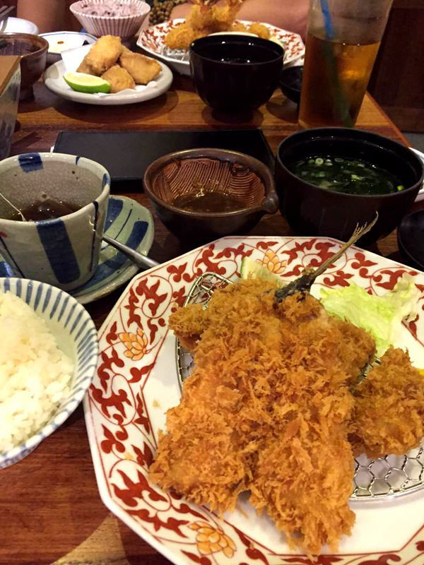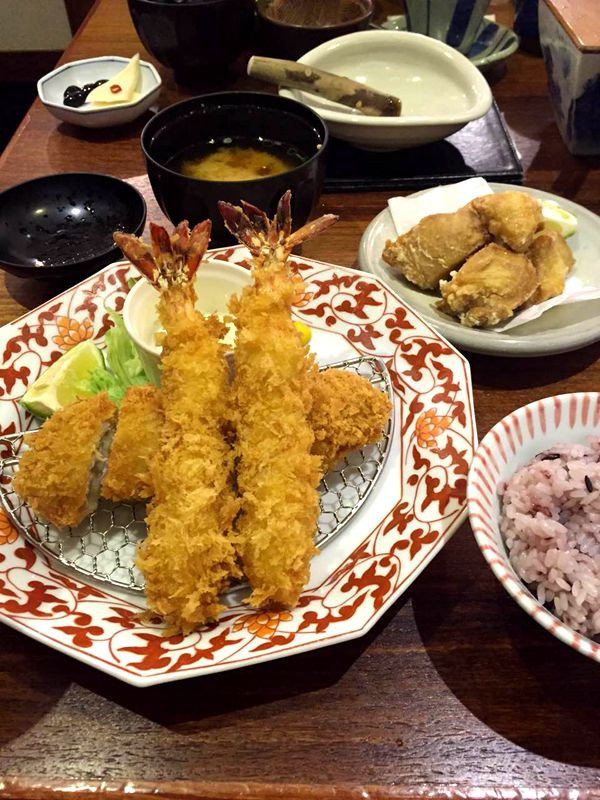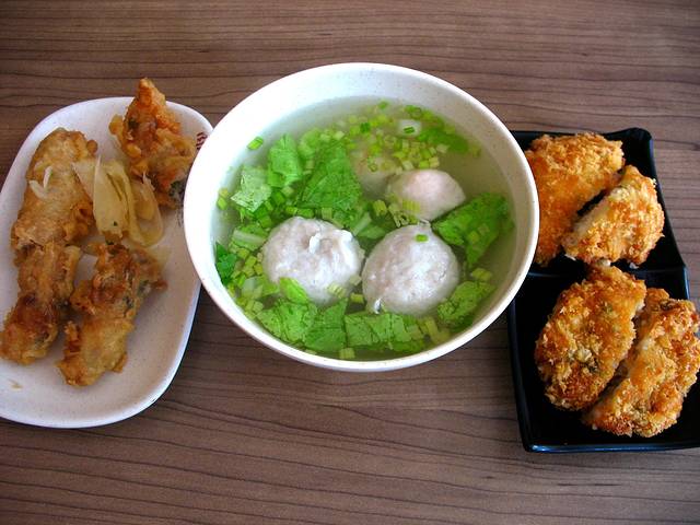 左边的是虾卷以虾与鱼浆制作而成,味道还不错;左边的是炸猪排,中间鱼丸汤。