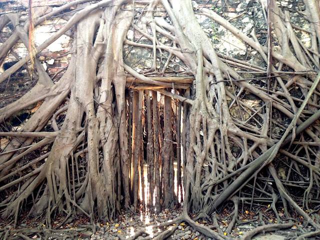 大榕树的繁殖能力甚强,仅仅半个世纪,把原德记洋行的仓库旧址覆盖得严严实实,遮天蔽日,盘根错节,穿墙而过。也许一开始不过是像菟丝花一般寄生于建筑之中,然日复一日年复一年,最后反客为主。