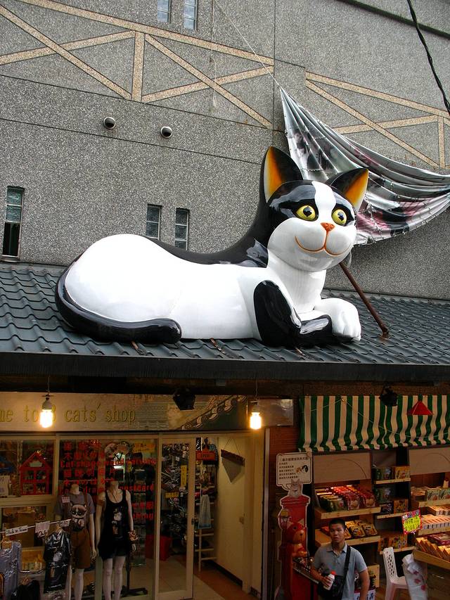 起点处有一家店,亮点是屋檐上的这只大猫,直瞪瞪地看着行人。
