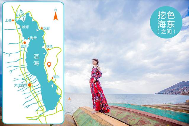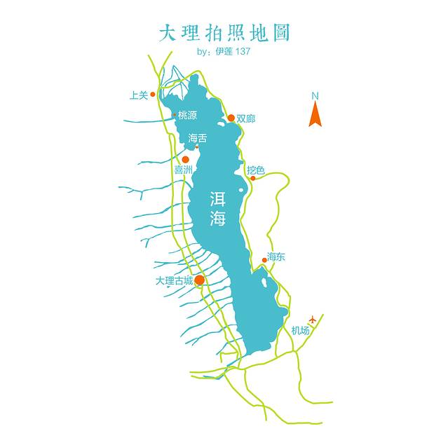 以下是我自制的大理拍照地图。第一天我在大理古城;第二天环洱海拍摄,绕着洱海看了一遍,经过了图中标注的地方,下面我会详细介绍;第三天我在双廊;第四、五天在古城附近的酒店度假。