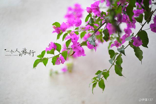 一束三角梅伸出来了,衬托米白色的墙壁,简单而美好。