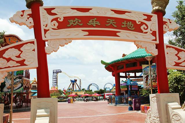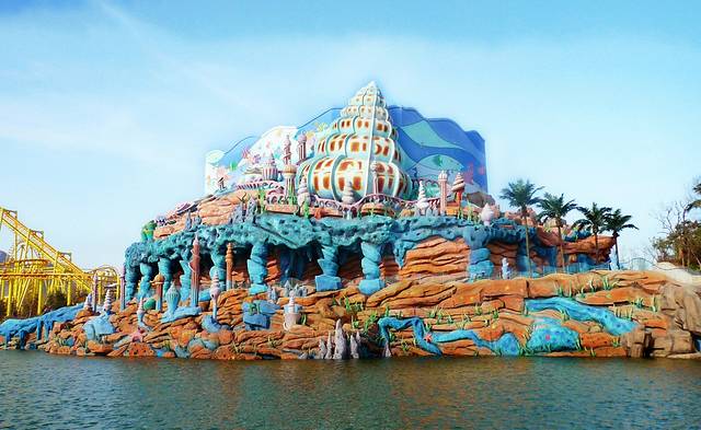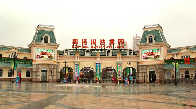 没想到我就这样灰溜溜的成为整个队伍的累赘了,这是我意料之外的事情。看着被碰肿的膝盖,真不知道一时心血来潮的冲动是为了什么。30十分钟不到,眼前有一座看上去很酷的公园出现了,方特欢乐世界主题公园,稀疏的人群里零落点缀一望无际的白雪地,我们小分队来了。这是一家以高科技主打、以中国神话为背景的文化科技主题公园,属于第4代主题公园,其实我不懂这几代怎么分的。嘿嘿……