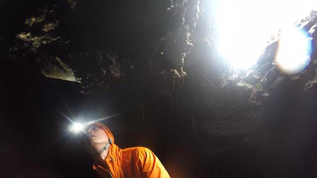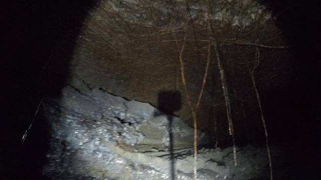 蕨类植物的根茎穿过熔岩层渗透至地底下,淅淅沥沥雨水淹着根茎滴在隧道内。