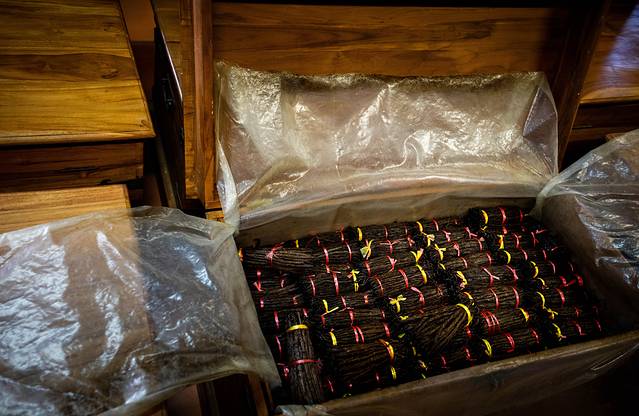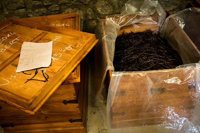 留尼汪最早没有香草,在尝试种植后也无法很好的培育,因为香草需要授粉后才能成熟,而只有原产地墨西哥的蜜蜂才会对他们授粉,把墨西哥的蜜蜂养在留尼汪让它们授粉,可蜜蜂排斥留尼汪的环境完全不授粉。图中是收获好还需要发孝的香草,一箱大概人民币几十万。