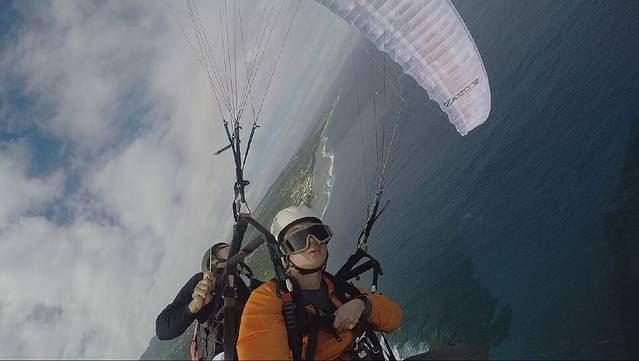 滑翔伞的起飞地点在一座半山腰的山坡上,风光与视野非常好,能看到左右大片海岸。这里不光有我们还有其他滑翔伞公司与我们一起飞