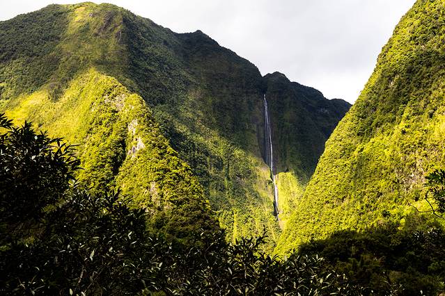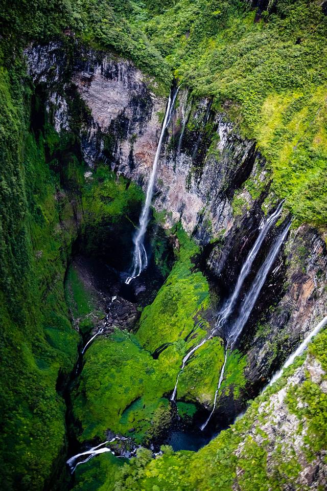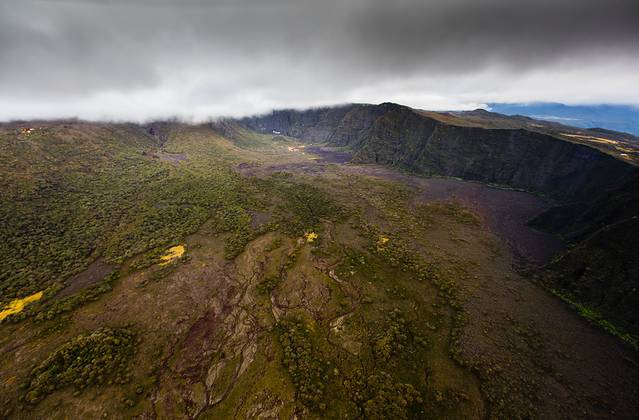 这里并没有冰为什么要叫冰斗呢?在几十上百万年前,留尼汪有两座火山。随着时间的推移其中一座的大的内部被冰川与雪水的腐蚀导致内部中空最后崩塌,形成四面环山中间凹陷下去的地形。时至今日样的现象仍在继续,只是规模小的很多,直接的现象就是每次发生后会产一条瀑布。