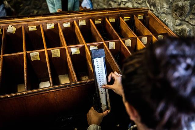 有一天一个奴隶受到了主人的责罚非常不开心,随手拿旁边的香草出气用力捏了一下,过了段时间这颗被捏过的香草成熟了,大家非常好奇再三研究终于发现是因为这个奴隶捏了一下,而香草竟然是雌雄同体,捏一下后两者就能成功授粉。之后这个授粉的办法在全岛种植园迅速传播,一直延续至今造就了留尼汪的香草盛业。图中是在为香草量尺寸,不同的尺寸分别放,越长的香草越贵。