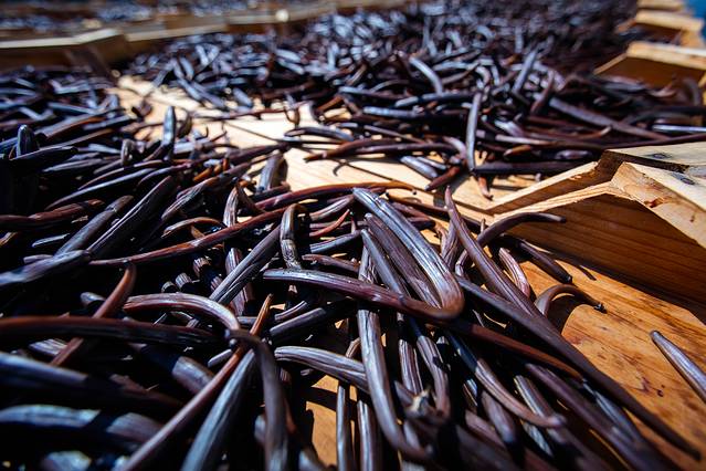 香草在欧洲大航海时代就是最主要的贸易货物之一。在现代香草仍然是欧美贸易的香饽饽,其独特的香味繁复的人工昂贵的价格,无不吸引着从事香草贸易的人。图中是以收获后在晒干的香草。