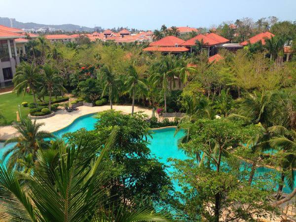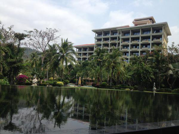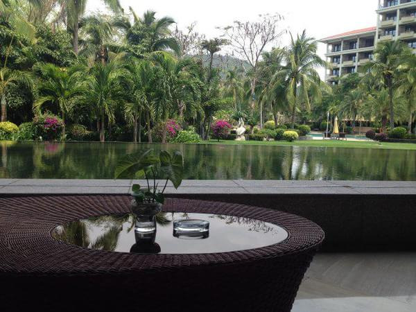 鹿回头国宾馆大堂往外眺望,营造出无边泳池意境的水面