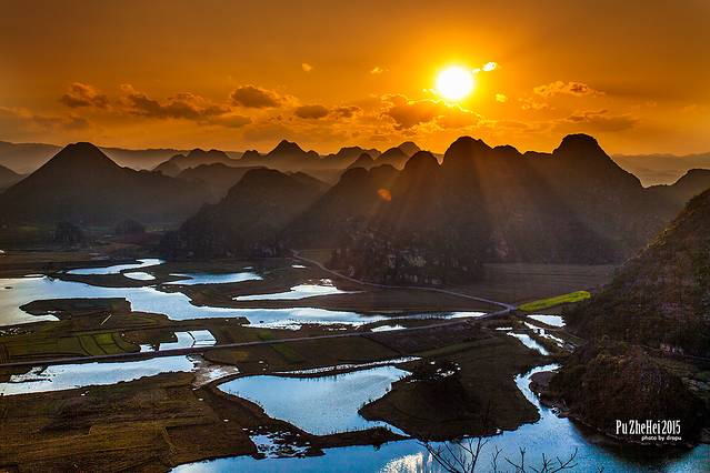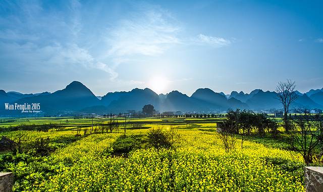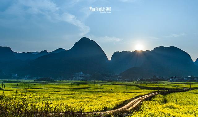 下午六点到了万峰林风景区大门,人头掺动,车水马龙,于是没有停留继续开往下纳村入住,适逢太阳落山,于是一路开一路停下来拍日落的景
