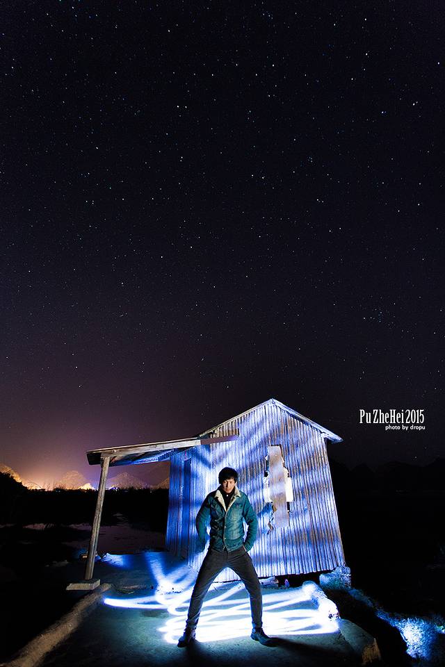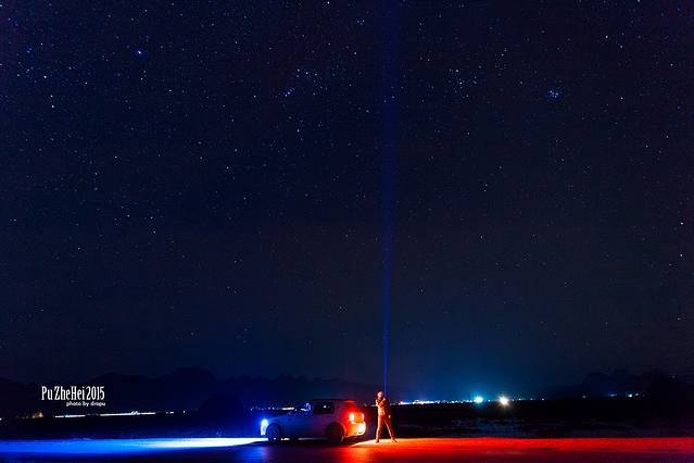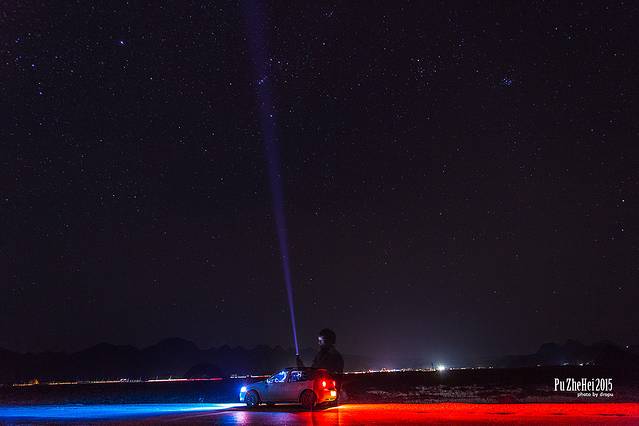 于是我们一路开到了景区门口比较黑的一片区域,开始各种自嗨。拍摄要领:屏住呼吸,站着不动!!!右手偷偷拿手电筒往身后乱画即可!!要是正好没有路过的车灯照在脸上,就变成了剪影的效果了。