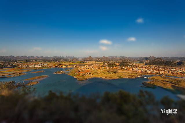 在普者黑度假村找了个可以让狗进的三星级酒店住下,这还是米粒儿第一次住这么好的酒店了,于是就给他在酒店里洗了个痛快的澡...开车瞎逛,天气渐好,出现了云南典型的蓝天白云,下午跑到青龙山拍日落,米粒儿和他娘在车里休息,后来发现真是明智之举啊,爬青龙山还是有点小累的,到山顶豁然开朗,一头拍日落另一头拍日出,可我实在爬不动,不打算第二天再来拍日出了,匆匆拍了几张就下山找饭吃了。
