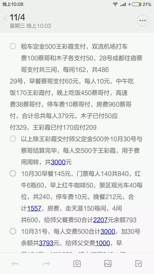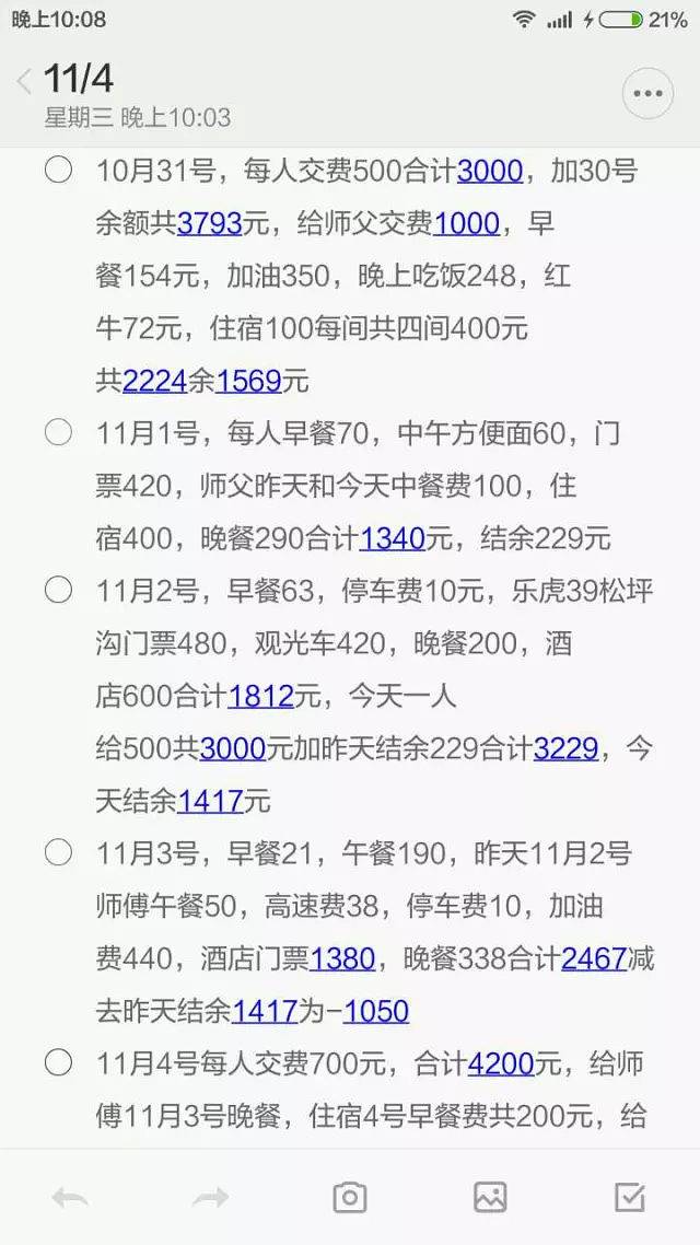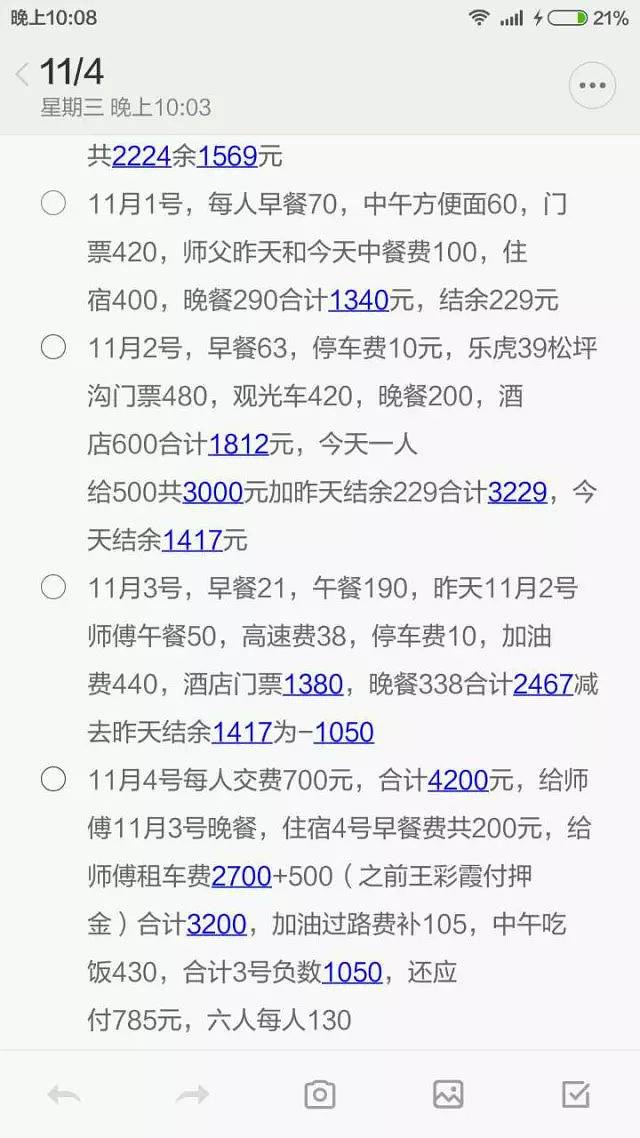 彩霞的记账截图,加去程机票745元和回程机票922元,这次从10月28号到11月4号8天的旅行个人一共花费约4300左右。