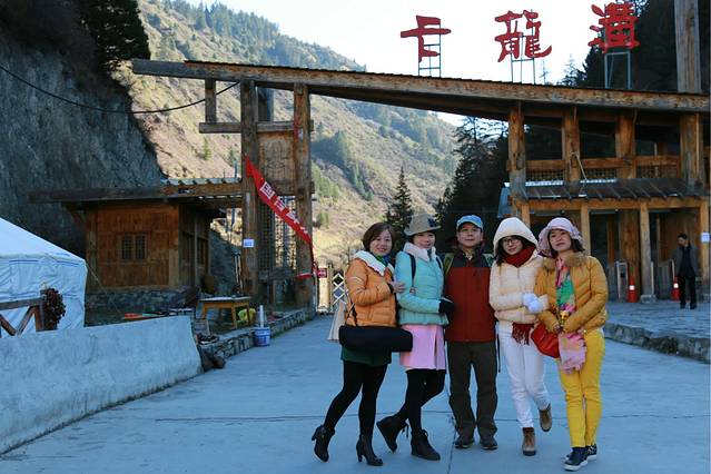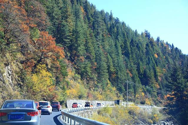 吃完早餐出发去卡龙沟,经过卡龙镇,镇上还是有很多住宿的,昨天晚上往卡龙沟方向开进,还没有投宿前司机师傅打电话问他的朋友卡龙沟有没有住宿的,他朋友说没有,原来这个信息已经是N年前的事情了,卡龙镇知木林往卡龙沟的这一大段路号称60里彩林也很美,跟奶子沟差不多。不过这两天彩林看多了,已经有点审美疲劳了,车上的妞们已经不发出“哇塞”的尖叫了。卡龙镇到卡龙沟路况还可以,大约20公里约40分钟到达。