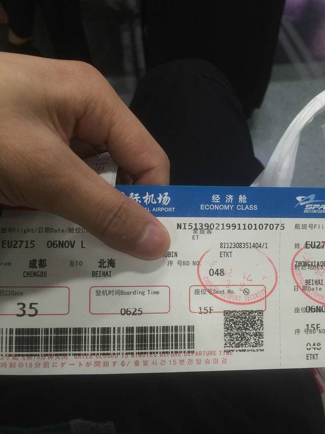 提前半个月预定了成都到北海的机票,这边航班好像是每隔一天有一班到北海的,所以这要提前预定为好。