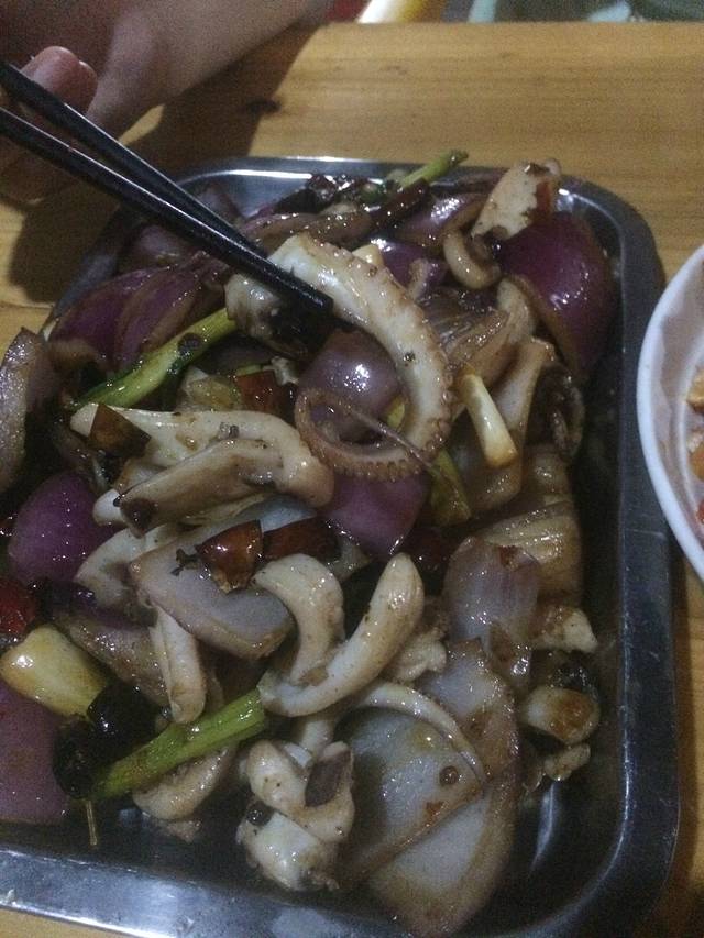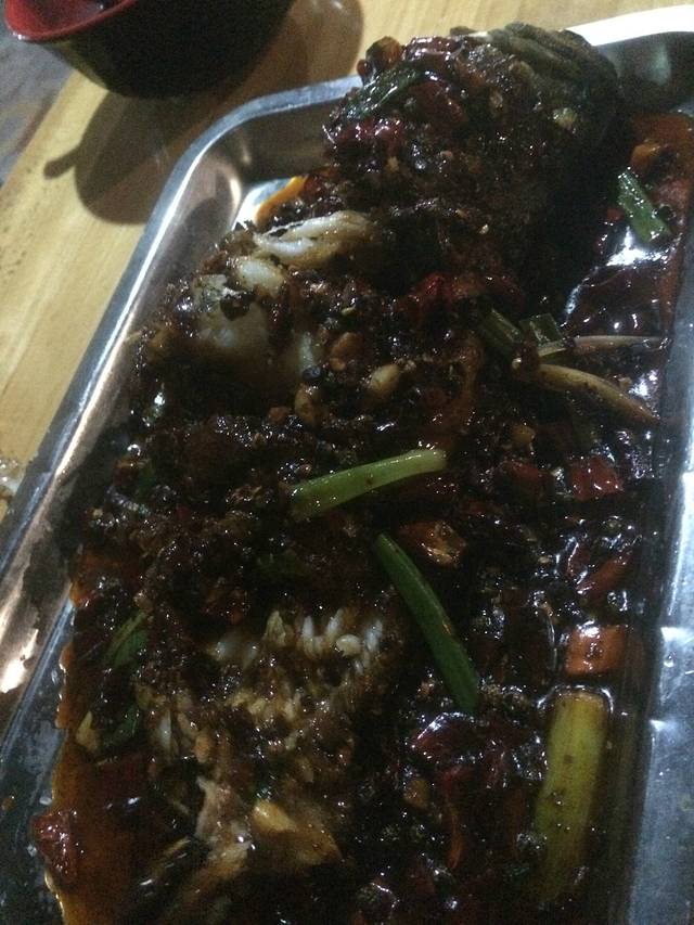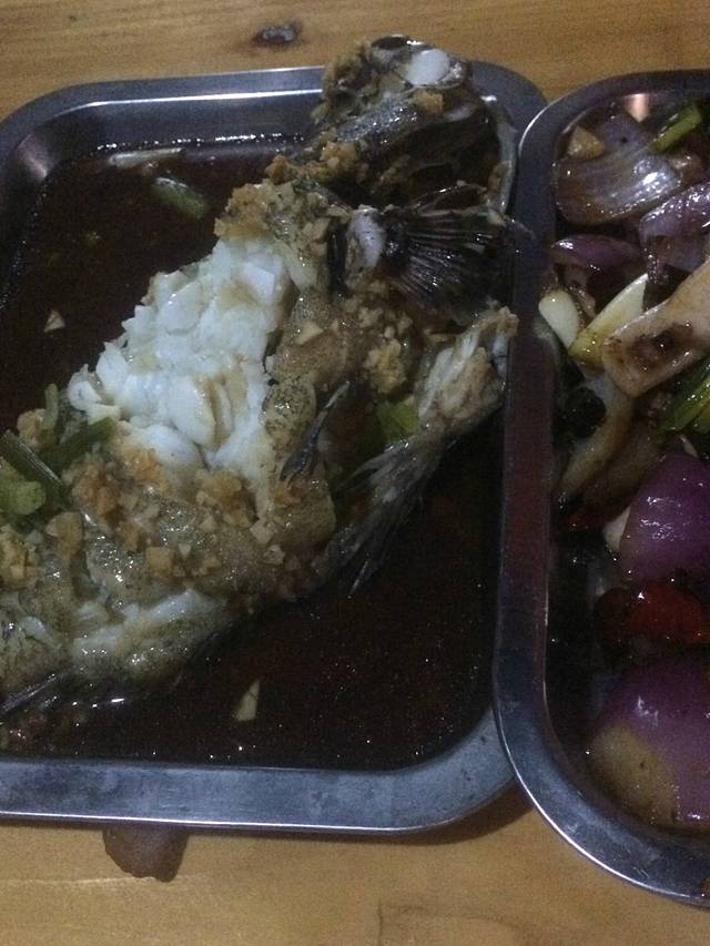 叫老板红烧的石斑鱼,,,看起来黑乎乎的,但是味道不错,,比上次吃的清蒸的要好,因为清蒸的石斑鱼腥味挺大,照片即兴照的,吃了几口才想起来一张吧,,,